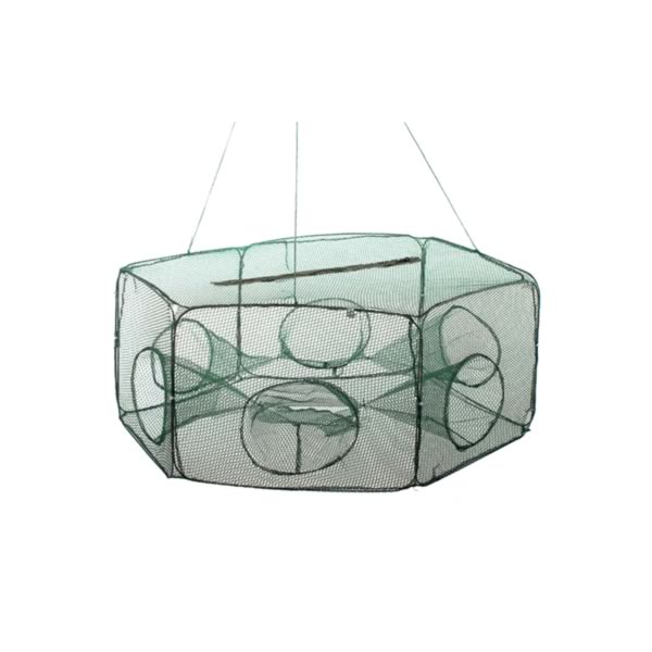 Diese praktische Köderfisch-Reuse in sechseckiger Form ist ideal zum Fang von Köderfischen. Sie verfügt über sechs Öffnungen, die den Fischeinstieg erleichtern und ein Entkommen verhindern. Dank des Entnahmereißverschlusses an der Oberseite können Sie die gefangenen Fische einfach entnehmen. Die Reuse ist komplett faltbar, was den Transport und die Lagerung besonders bequem macht. Erhältlich in zwei Größen: Ø 60 cm, Höhe 24 cm und Ø 64 cm, Höhe 25 cm – perfekt angepasst an verschiedene Angelbedürfnisse.