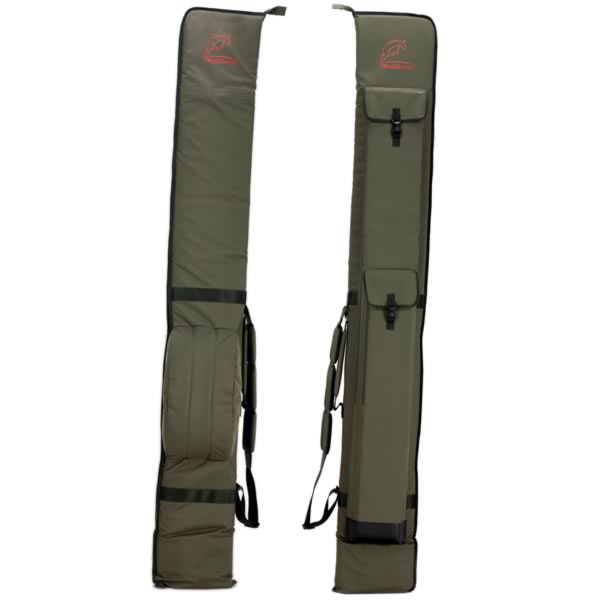 Die Specimen Spezial-Rutentasche ist der perfekte Schutz für hochwertige Karpfenruten – besonders beim Transport zu anspruchsvollen Angelplätzen. Mit einer Länge von 2,15 m und einem robusten Aufbau aus strapazierfähigem 600 Denier Polyester bietet sie optimalen Schutz vor Stößen, Nässe und Schmutz. Drei wattierte Rollen-Aussparungen und eine zusätzlich gepolsterte Innenüberlappung sorgen dafür, dass Ruten und Rollen sicher fixiert und geschützt sind. Zwei große Außentaschen bieten Platz für Schirm, Erdspieße oder weiteres Zubehör. Ein stabiler Tragegriff sowie ein wattierter Schultergurt machen den Transport besonders komfortabel – selbst über längere Distanzen.