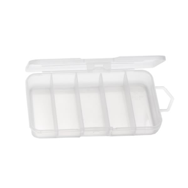 Diese große Zubehörbox mit den Maßen 16,5 x 9,5 x 2,5 cm verfügt über 5 praktische Einteilungen, die ideal zur übersichtlichen Aufbewahrung von Angelkleinteilen wie Haken, Perlen, Wirbeln oder Bleien geeignet sind.